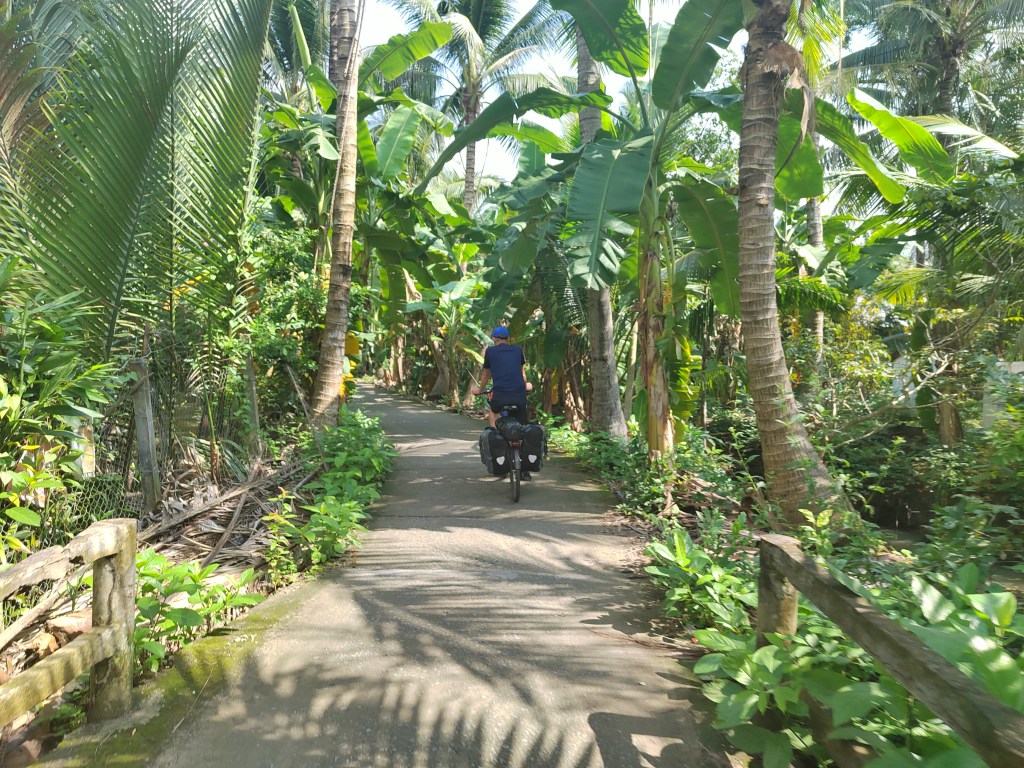 We are in the Mekong Delta area in the far south west of Vietnam. It’s not a popular destination in a country that has a lot to offer, and for the first few days other than “Hello” no one speaks a single word of English. We’ve never expected people to anywhere, but it’s the only place we’ve been where they haven’t. Doesn’t matter though. We’ve never experienced so many people wanting to say “hello”, wave, give us thumbs up, high fives or ride along next to us. This whole region is a friendly place, but the Vietnamese have been unguardedly warm and welcoming. There is a carefree joie de vivre and it’s infectious.