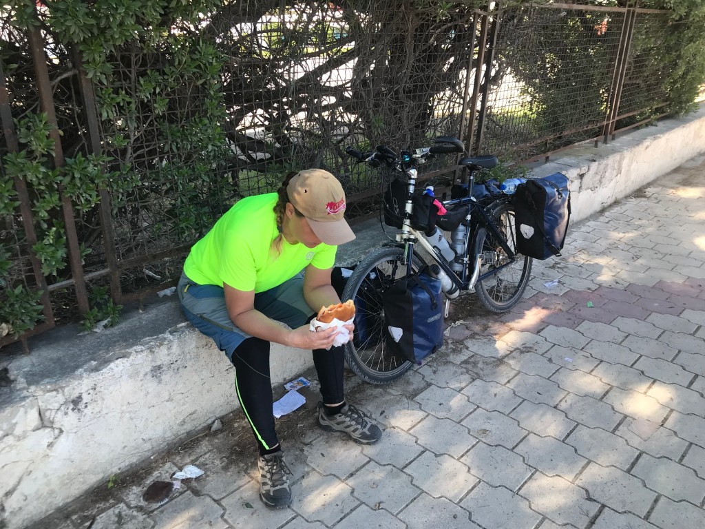The cycling is unremarkable. The roads are all the same. Flat, straight, dusty, monotonous. The towns are all the same too. Dusty, white washed, often lined with palm trees. It’s busy, but not as chaotic as I thought it would be. The atmosphere is mostly sullen or indifferent. But when we break the ice things do change a bit. I see an A-board with a picture of food and head straight for the accompanying establishment like a moth to a flame. It looks like someone’s kitchen, with some glass shelves showing what bread they offer, which in this case is just one kind. The man and his wife here are selling a kind of roll which is called a chapatie. But it’s not like an Indian chapati, it’s more like an enormous breakfast muffin cut in half and filled. Tinned tuna is the one filling that can always be banked on at these roadside stops, and the condiments are usually harissa, some kind of green chilli chutney and a garlic & yoghurt sauce. They are delicious; right up there with Vietnamese banh mi for a roadside pit stop.