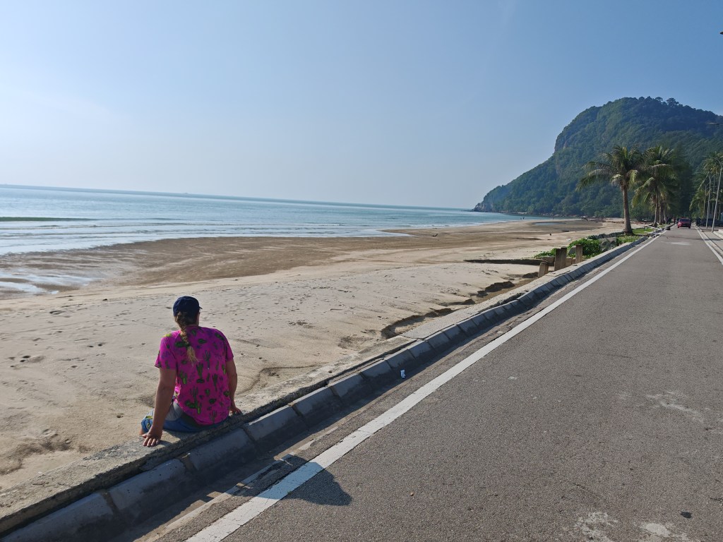 The hazy day dawns and we head for a small coastal road. Along the way I see my first ever dusky langur (leaf monkey) who is absolutely beautiful, and probably cheeky. The road closely hugs the white-sand beach, which is lined with food stalls and coconut palms. We have some gentle climbing back inland a bit, which actually is really nice (for me, not Richard.) We pass a large troop of macaques, who all disappear into the jungle apart from the alpha female, who parades along the side of the road. This species of primates has a female leader of each group, a role she then passes down to her daughters.