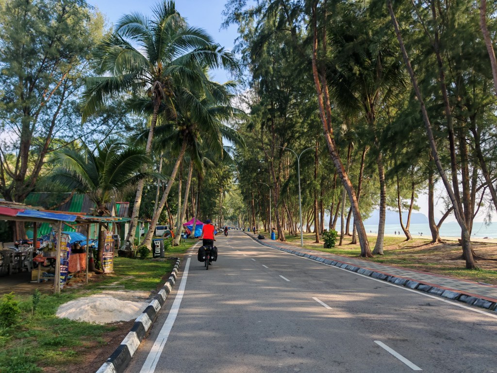The next couple of hours are the best cycling we’ve done in Malaysia. Lots of people wave and shout greetings at us. We have a big tailwind, there is little traffic and the road is lined with huge trees, a kind I haven’t seen before, and it means we are shaded from the heat and actually enjoy riding along. I want to find out the species of tree and who planted them so I can start a new religion and give thanks. It’s still not easy, but we do a complete 180 and commit to staying in Malaysia.