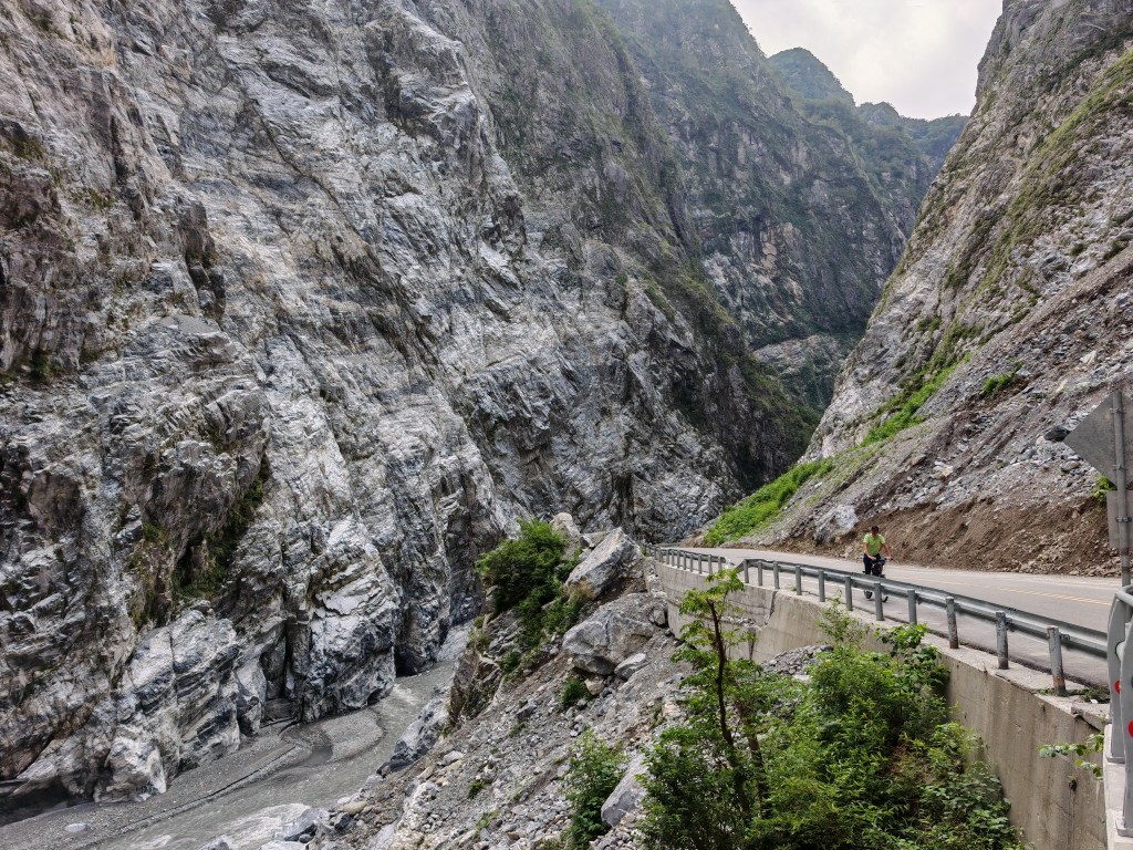 We are the last ones to leave, but only just. Back the way we came we make it through one tunnel, and then get to an open-sided tunnel with some cones blocking part of the road. Out of a road crew, a woman shouts at us to stop as we’re about to pass the cones. She tells us work has started and the road is closed. It’s gutting because the four vehicles who left the clearing slightly ahead of us had clearly been let through. But I don’t think arguing will do us any good. I think our case is taken up by someone else though. Another women on the crew is clearly very angry, she is shouting loudly at the first woman and gesturing around. This is really unusual in Taiwan, but she doesn’t let up. For us it’s a bit of disaster. The road doesn’t open again for a couple of hours, so we’re stuck here. We’ll miss the only train we can get back, and cycling back will be in the dark. The view at least is mesmerising. The angry woman takes off in disgust up the road on a moped, after a few parting shots at road block woman. A short time later a pickup truck comes from the same direction, and the man in it says a few words and points at us. Road block women calls to us and gestures that we can go through, saying the man in the car is her boss. We follow the car passed some heavy machinery and work groups, and then he leaves us behind and we’re in the clear. There is no traffic at all now the road is closed, so we have the National Park completely to ourselves.
