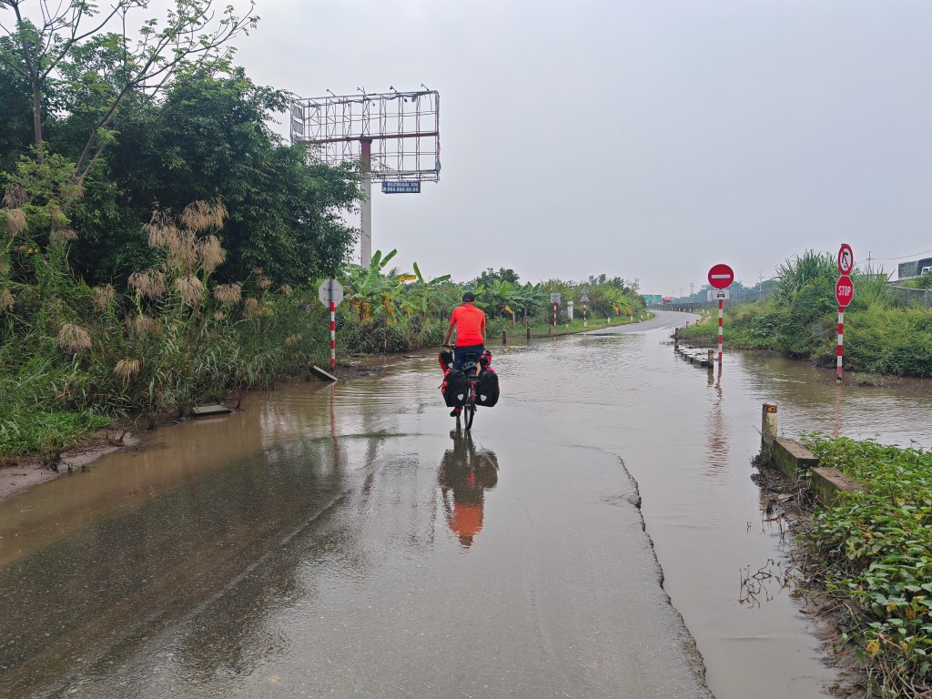 It actually becomes a bit boring for a couple of hours. Some excitement is restored with flooding on part of the road. Richard has to take his shoes off because it’s too deep, and we have to balance the front panniers on the handlebars, but it’s better than a long detour.