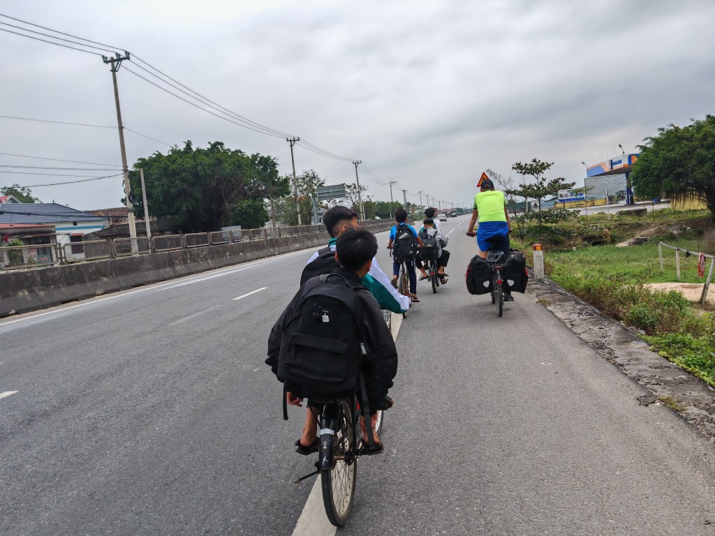 We’ve cycled in Vietnam before, and spent a long time in this part of the world, but the traffic is still worrying me almost to the point of panic attacks. As always, once we’re immersed in it, it’s easier. Going with the stream of mopeds is like being in a shoal of fish; everyone somehow avoids each other and moves in a flow. At the big junction I was most worried about, there’s a teenage boy on a bike in front of me so I latch on to his tail and unashamedly use him as a shield.