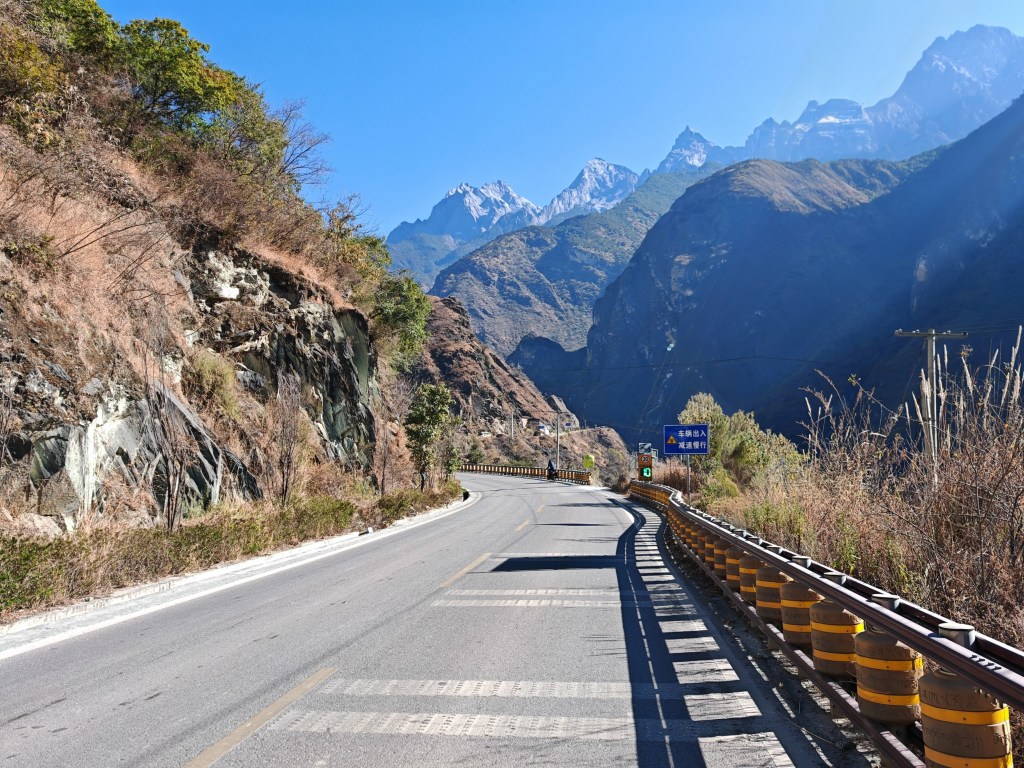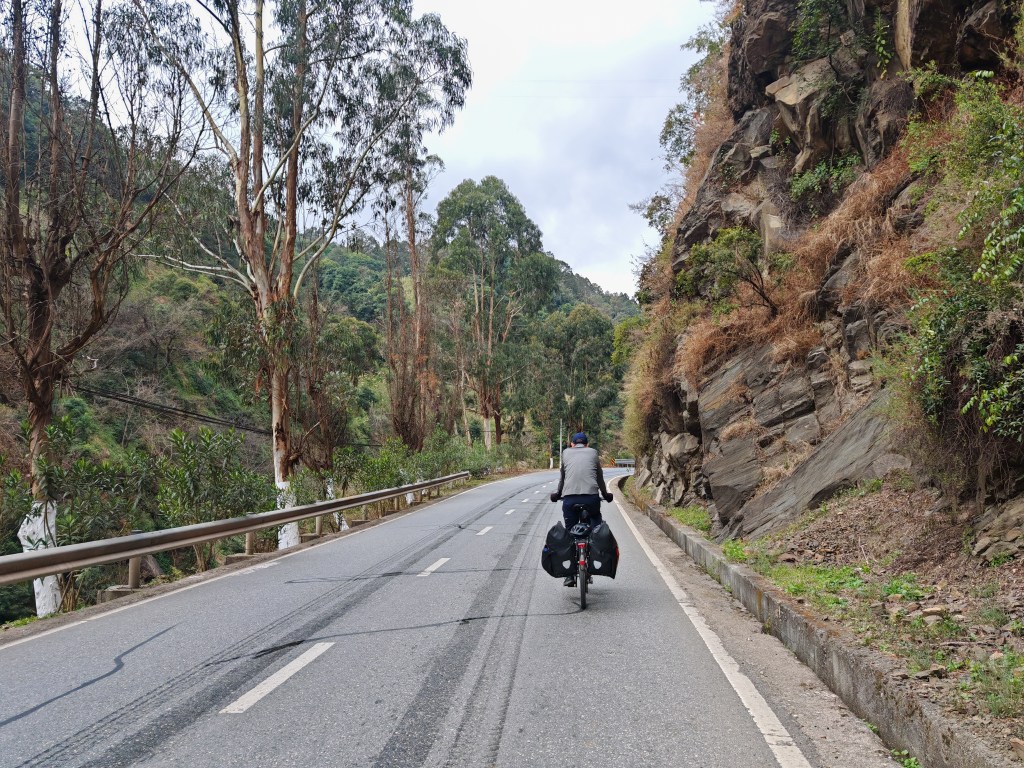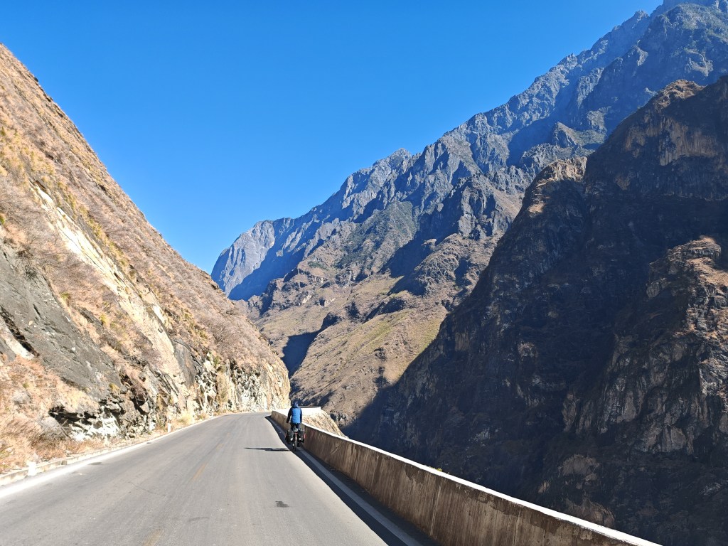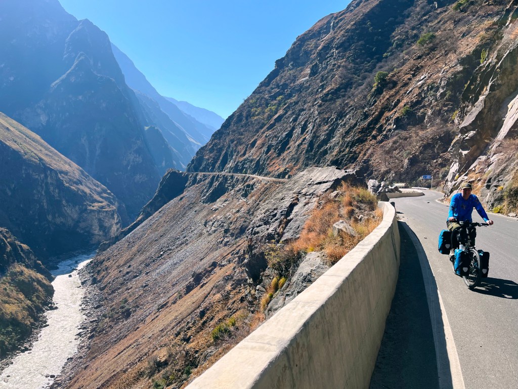 Most of the climbing is in a short space of time, and it’s painful and dramatic. We get some thumbs up and clapping from the Chinese tourists who have stopped to look at the various viewing points, so can preen around in the glory of that. The road is quite narrow, but drivers are sympathetic and give us lots of space. I don’t like heights at all, and I was worried it would cloud my enjoyment of the day, but it’s not as precarious as I thought it would be. Until recently, the sheer drop down to the river over 1,500 feet below was barely protected, but now there is a large concrete barrier, so even though it’s windy it feels quite safe.