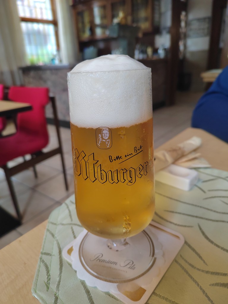 | Bitburger Premium Pils: German Pils/Lager, 4.8% (Bitburger Brauerei) Really clean and crisp. Light malt with a bit of cereal. A genuinely refreshing and balanced lager, perfect for a hot day. This seems to be the go-to after work or with dinner lager in the West of Germany, and it’s easy to see why. 7/10 | ![]() |