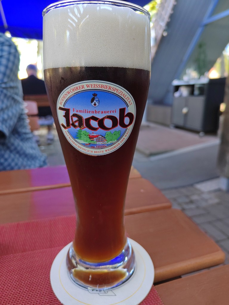 | Jacob Weissbier Dunkel: German Wheat Beer (Dunkelweizen) 5.3% (Familienbrauerei Jacob) Quite strongly malty, but at the same time tangy and metallic. The usual banana and clove. It’s full bodied and robust, but a bit one-dimensional. 7/10 | ![]() |